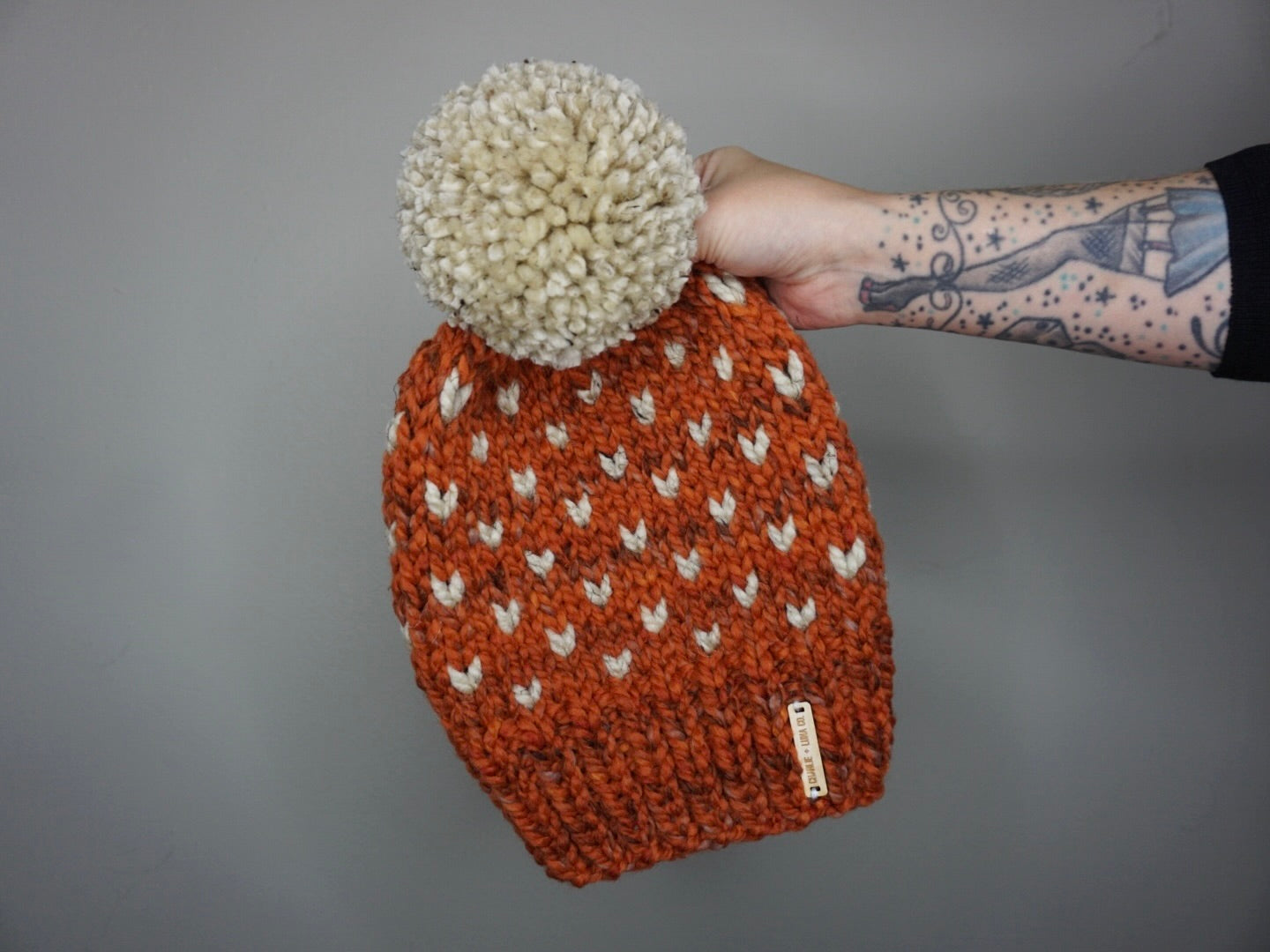 •topped with jumbo yarn pom